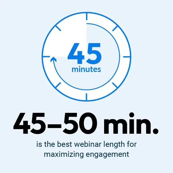 45-50 minutes is typically a good length of time for maximizing engagement, but keep in mind how invested your viewers are in the webinar. Usually you can count on longer time commitment for live webinar events and paid webinars as opposed to on-demand or free webinars.