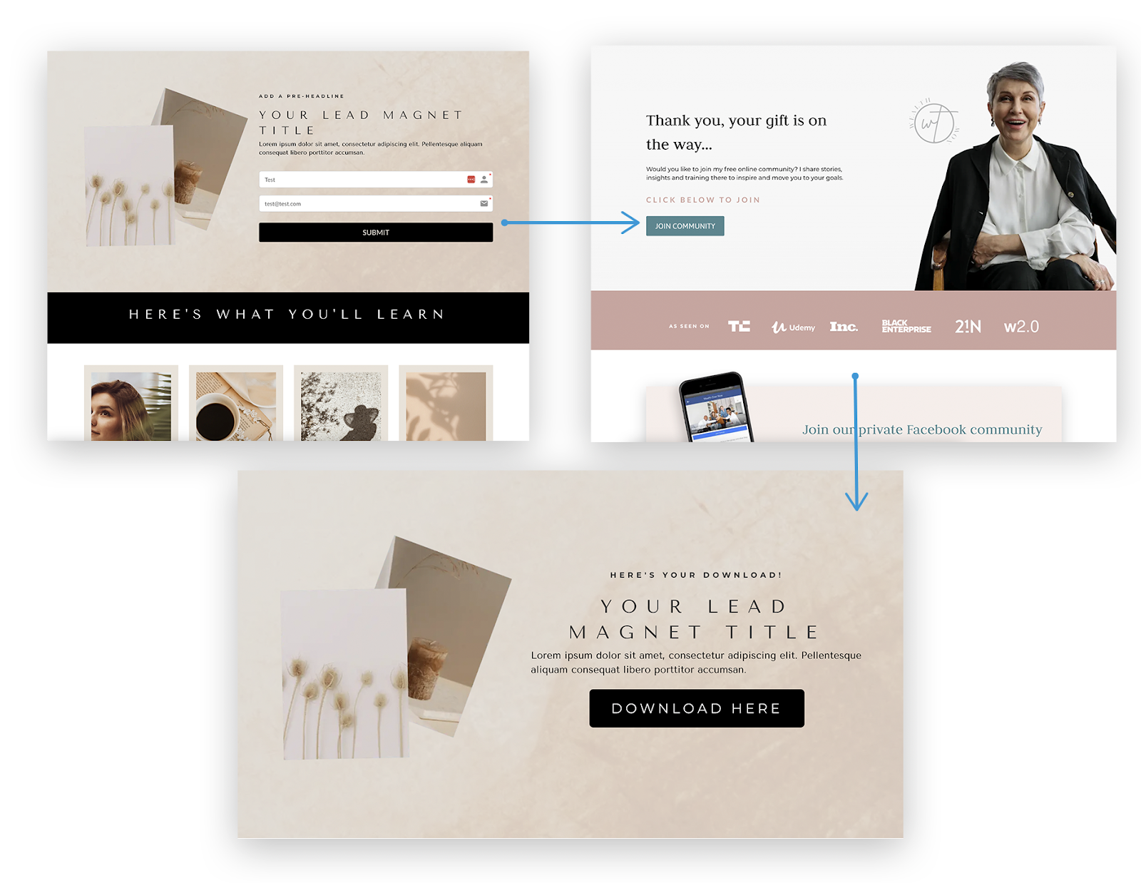- An email marketing campaign promotes the lead magnet and links to the squeeze page. The page includes:
