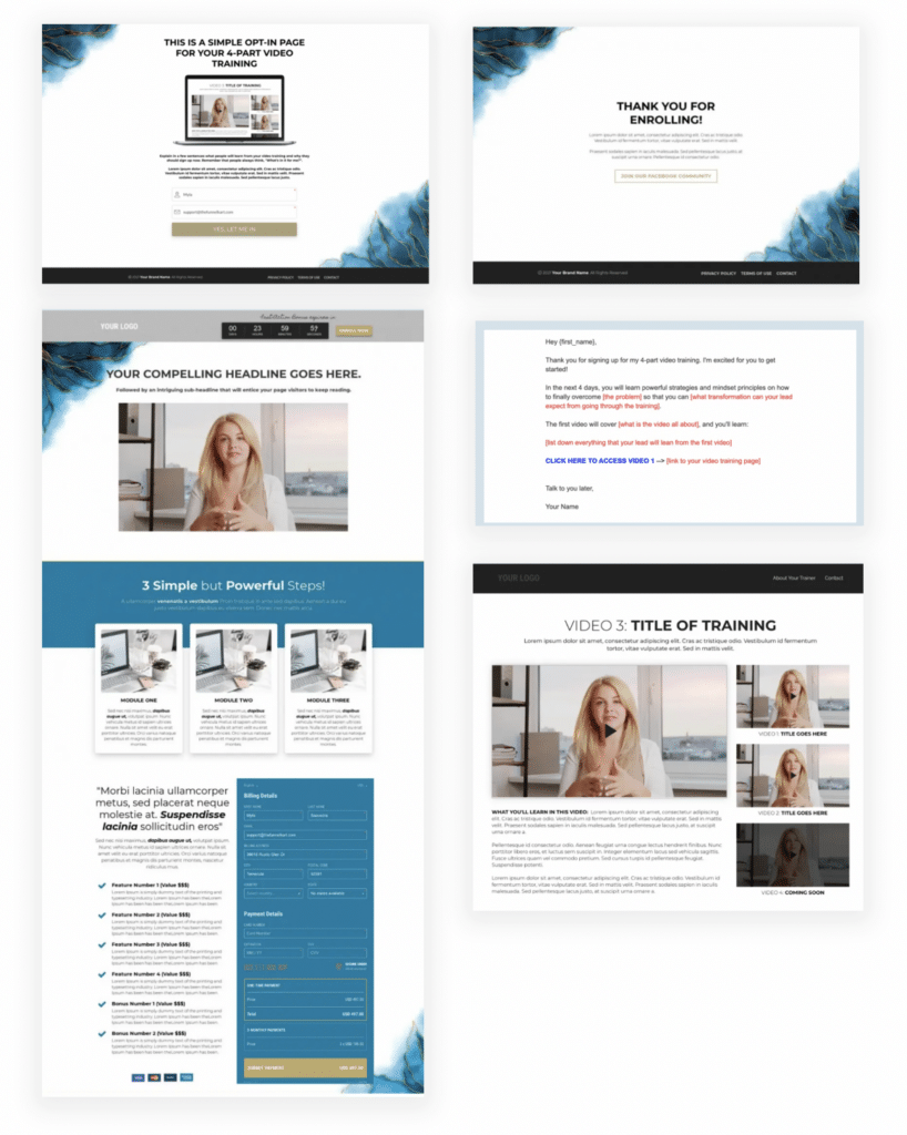 In this funnel example, visitors opt-in to a free video series or through a targeted squeeze page. Over the next few days, they receive a new email each day with the next video in the series. At the end of the free course, participants receive an offer for a paid service, subscription, or product.