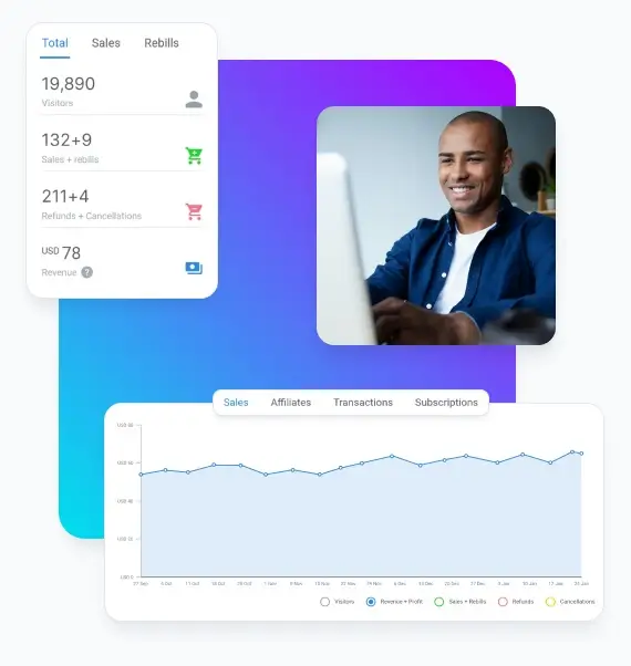 Easily break down your sales data sources by timeframes or categories, such as the number of website visitors to your checkout pages, total sales and rebills, refund rates, cancellations, and total revenue