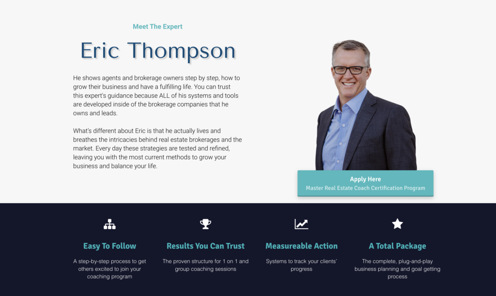 Eric Thompson is a real estate coach who offers a comprehensive certification program for real estate professionals. His services include coaching programs designed to enhance performance, leadership skills, and profitability in the real estate industry.
