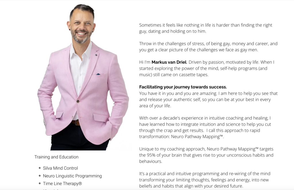 Markus van Driel is a life and relationship coach who empowers LGBTQ+ individuals, particularly professional gay men, to build meaningful connections and achieve personal growth. His services include individual coaching, energy healing, and online programs tailored to those navigating challenges in dating, relationships, breakups, and balancing demanding careers. Markus’s approach focuses on fostering confidence, enhancing communication, and aligning personal values with professional and relational goals.