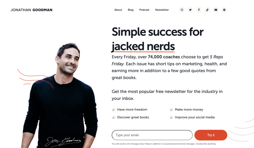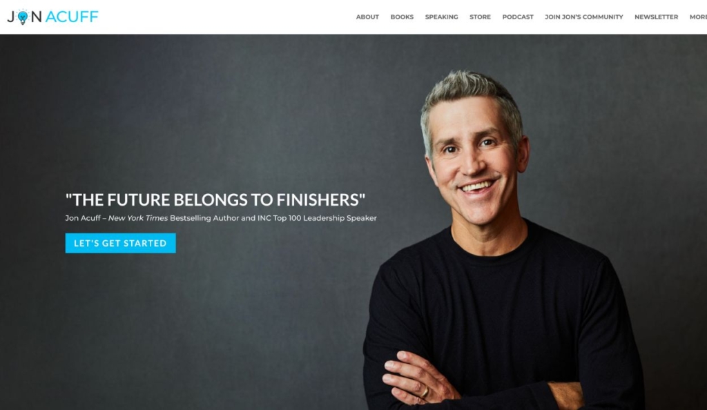 - Jon is a speaker and author who uses his personal brand to promote a wide variety of resources — including a podcast, community, and email newsletter.