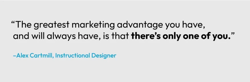 As a content creator, you are your brand. Your followers will listen to you because they value your expertise. As instructional designer Alex Cartmill says, “The greatest marketing advantage you have, and will always have, is that there’s only one of you.” However, that doesn’t mean every task must be completed by you.