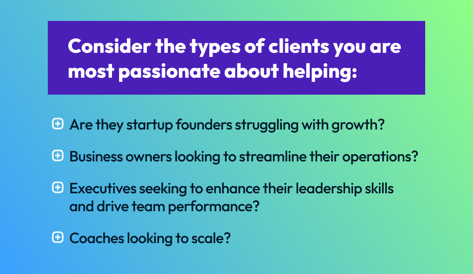 For example, you might specialize in helping small business owners scale their operations or focus on coaching entrepreneurs who are launching startups.