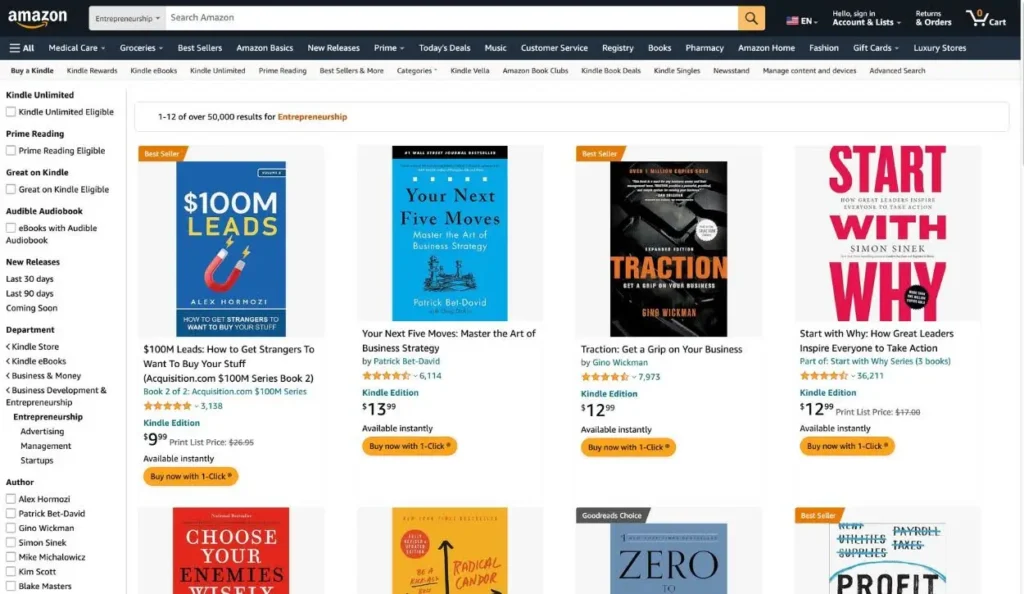 Snapshot of bestselling ebooks in the entrepreneurship category on Amazon Kindle