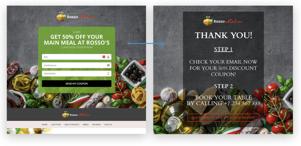 - After submitting the form entry, visitors are taken to a thank you page that lets them know how to get the coupon from their email, encourages them to book a reservation, and provides a way to get back to the main website.