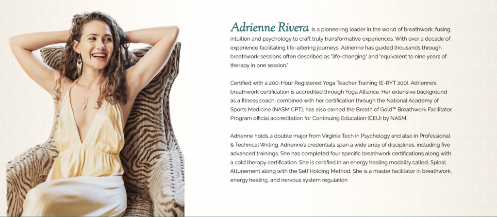 Adrienne Rivera is a spiritual business coach and founder of Breath of Gold™, a breathwork training company dedicated to helping individuals regulate their nervous system and connect more deeply within themselves. She offers breathwork sessions, certification programs, and spiritual business coaching, aiming to support coaches and healers in growing their businesses through a blend of energy work and strategic guidance.