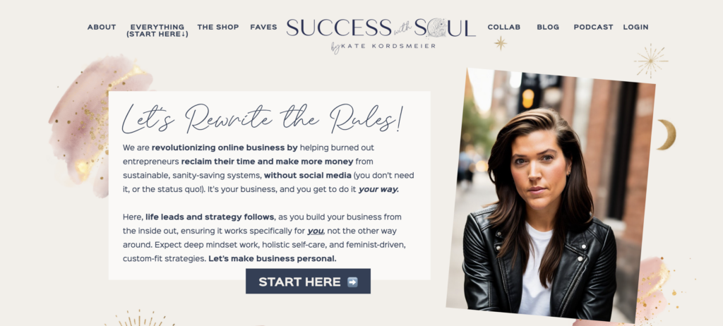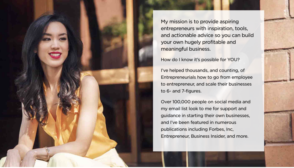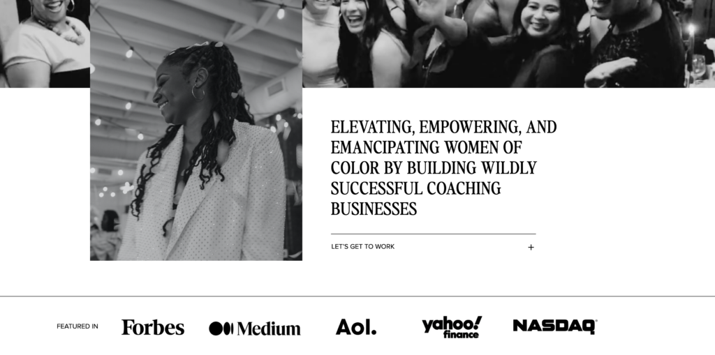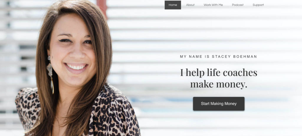 The website has a straightforward layout that emphasizes clarity. This no-nonsense approach is found in the copywriting. Her simple “I help life coaches make money” statement in her website’s header clearly reflects her mission and brand.