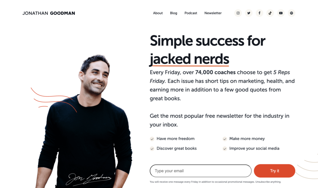 The PTDC website has a simple design that features Jon’s experience and media appearances. The comprehensive content library and actionable insights demonstrate Jonathan’s expertise, while client success stories add credibility to his coaching services.