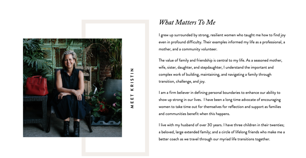 Her website positions her as an expert, including reviews, a biography, and press mentions. Clear and encouraging copywriting and authentic testimonials provide visitors with a genuine sense of the positive changes clients have experienced through her coaching.