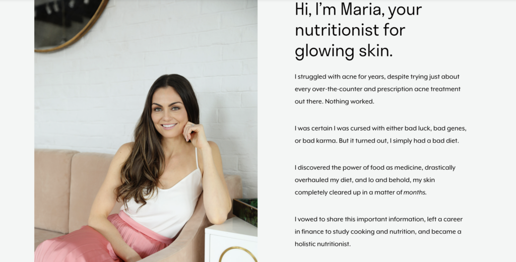 Her website features a vibrant, fresh design, high-quality imagery, and an intuitive layout. The website’s copywriting, which draws from her personal struggle with skincare and her numerous client success stories, effectively communicates the value and impact of her coaching services.