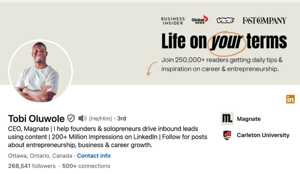 Tobi Oluwole is an entrepreneur, content creator, and coach who helps people build successful careers and businesses through content marketing, particularly on LinkedIn.