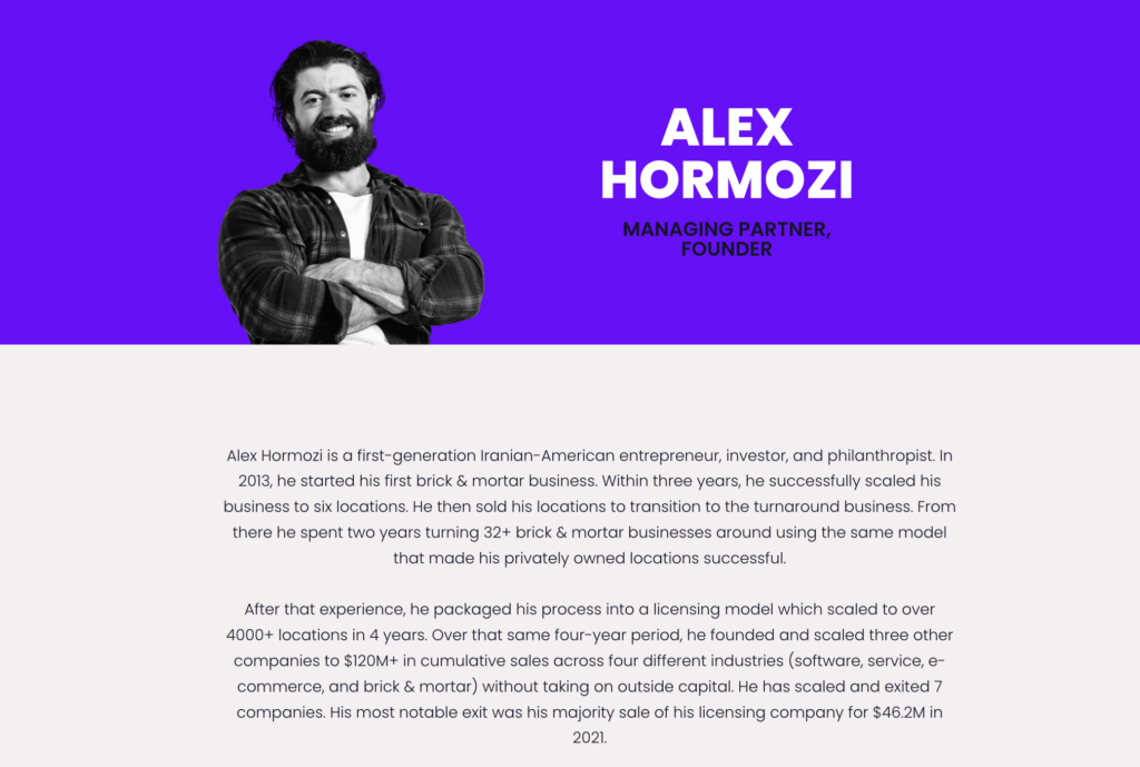 Alex Hormozi is an entrepreneur and investor best known for his ability to scale businesses rapidly and his no-holds-barred approach to marketing and sales advice.