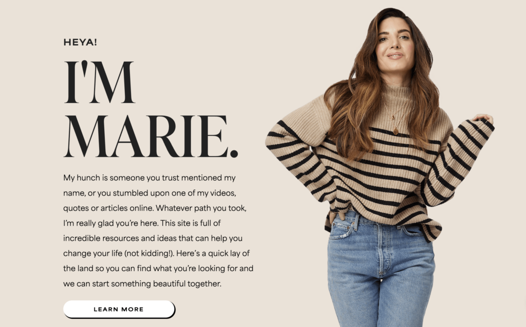 - Marie’s brand combines positivity with actionable strategies. She’s known for her ability to make complex business and life concepts accessible and engaging.