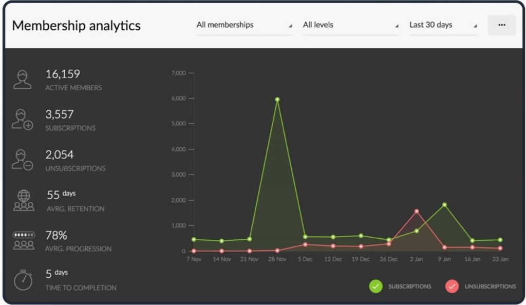 Growing your membership business relies on learning from your current and past users, and using that knowledge to give members the best experience possible. The membership platform you choose should make this process easy – with detailed member profiles and progress tracking. It’s not enough to know who has signed up for which membership plan – you’ll also want to know their level of engagement with your products or services. Course creators, for example, should be able to track their students’ progression through the materials. This information is crucial for knowing whether or not the students are gaining value from the course and how quickly they are processing information – among other important insights.