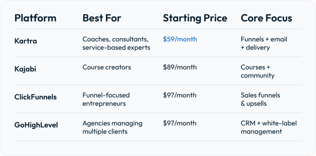 After reviewing the top contenders — Kartra, Kajabi, ClickFunnels, and GoHighLevel — Kartra Essentials stands out for its simplicity, affordability ($59/month), and full suite of connected tools built for coaches, consultants, and local service professionals.